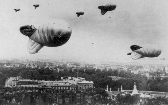 [Image: Barrage balloons above London, courtesy of Wikipedia].