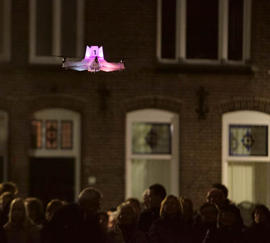 [Image: Liam Young flying self-illuminated drone quadcopters in Holland for a celebratory nighttime crowd].