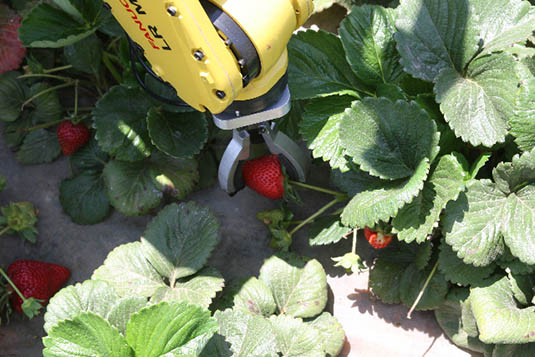 [Image: A robot strawberry harvester, courtesy of Robotic Harvesting LLC].