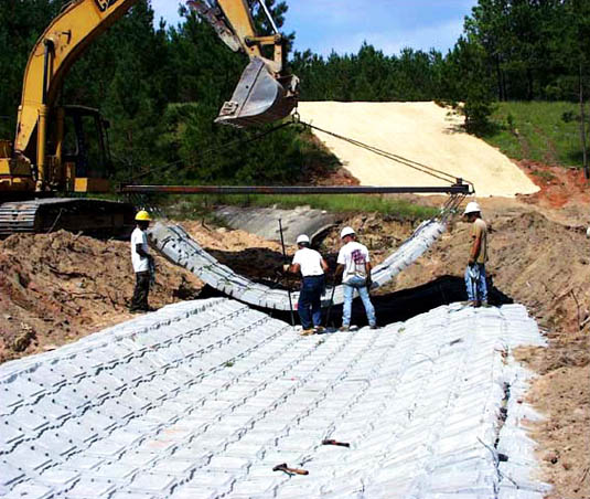 [Image: An otherwise unrelated photo of concrete block installation atop a geotextile base, courtesy of the Directorate of Public Works, Ft. Jackson, South Carolina].