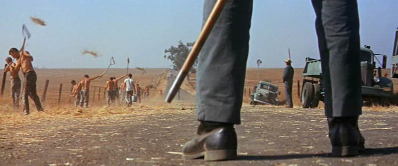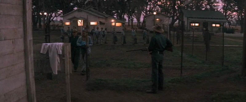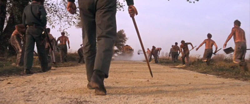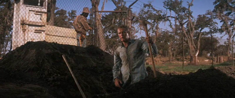 He is immediately introduced to a new set of limitations. “We got all kinds,” the camp warden announces, referring to the prisoners kept behind fences there in the subtropical heat; but all of them have had to learn how to stay put. To this, the warden adds, “in case you get rabbit in your blood and you decide to take off for home,” you’ll be rewarded with more time in prison and a “set of leg chains to keep you slowed down just a little bit, for your own good. You’ll learn the rules.”