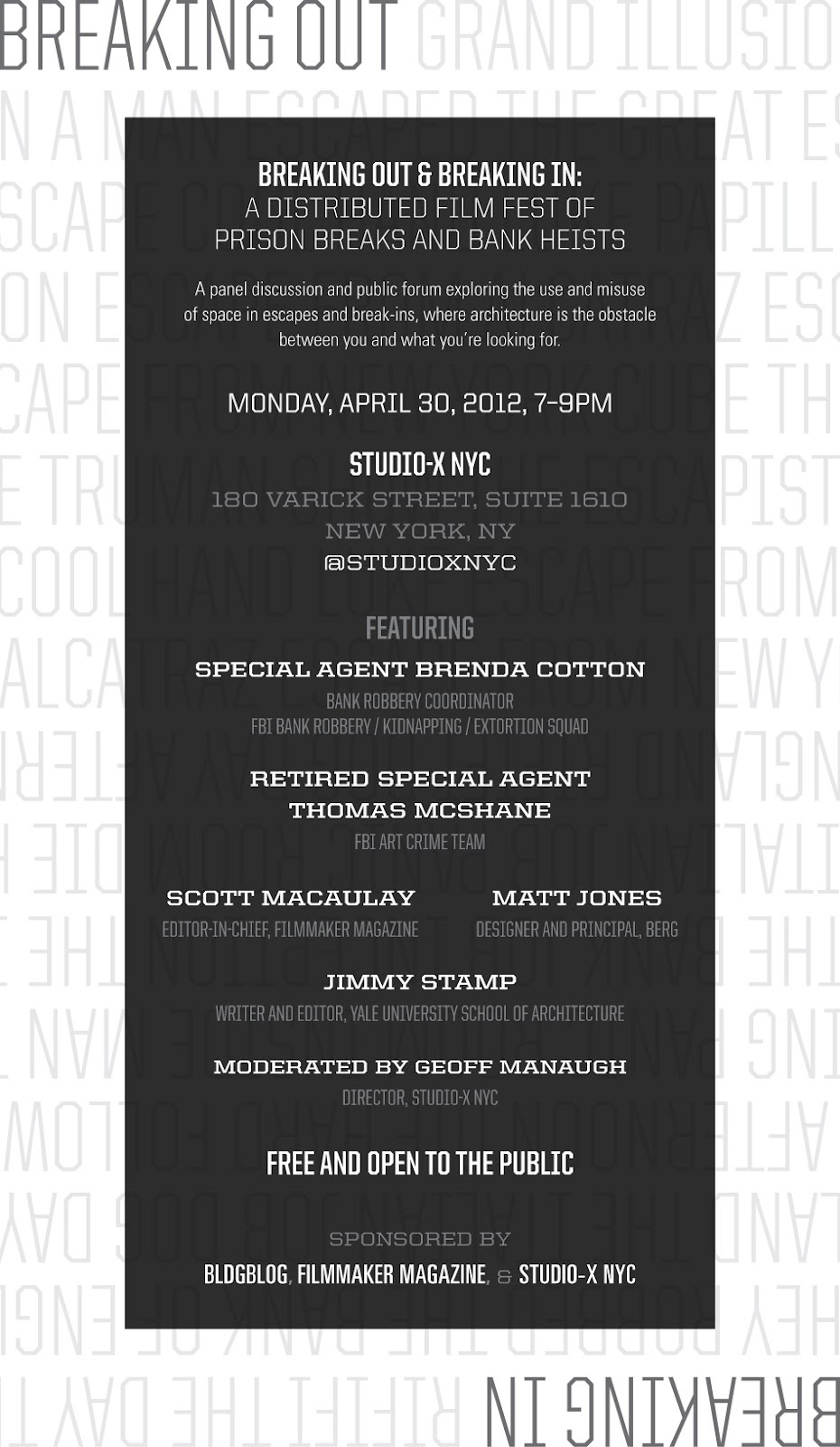 Stop by to hear Special Agent Brenda Cotton, Bank Robbery Coordinator for the FBI’s Bank Robbery/Kidnapping/Extortion Squad; Thomas McShane, Retired FBI Special Agent from the Bureau’s Art Crime Team and co-author of Stolen Masterpiece Tracker; Scott Macaulay, editor-in-chief of Filmmaker Magazine, co-sponsors of the Breaking Out and Breaking In film festival; Matt Jones, designer and principal at BERG; and Jimmy Stamp, writer and editor at the Yale University School of Architecture and co-organizer of last year’s symposium on the architecture of the getaway, the hideout, and the coverup.