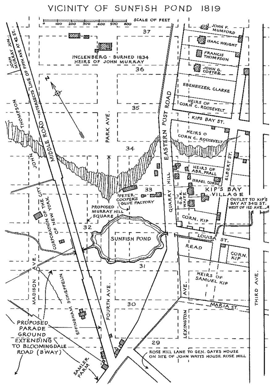 After following a series of links leading off from Steve Duncan’s ongoing exploration of New York’s “lost streams, kills, rivers, brooks, ponds, lakes, burns, brakes, and springs,” I found the fascinating story of Sunfish Pond, a “lovely little body of water” at the corner of what is now 31st Street and Fourth Avenue. “The pond was fed both by springs and by a brook which also carried its overflow down to the East River at Kip’s Bay.”