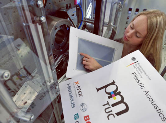 [Image: Printed electronics produce 2D loudspeakers; photo by Hendrik Schmidt, via Printed Electronics World].