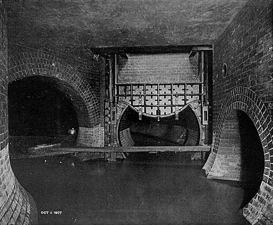 [Image: Great iron doors beneath the city; courtesy of Sewer History].