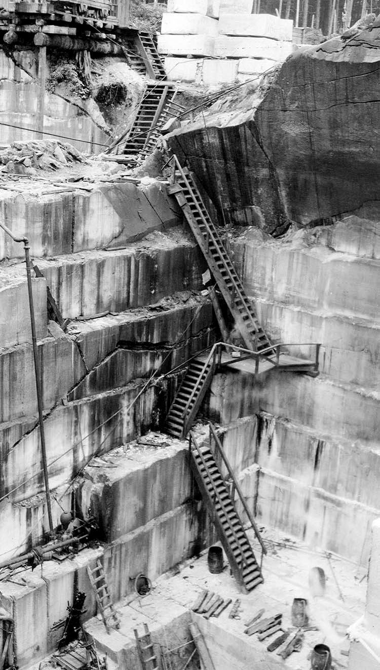 —which is nothing, really, compared to the descent seen in the next image, a series of ladders that backtrack down into the newly revealed depths of the Vermont Marble Company quarry in Tokeen, Alaska.