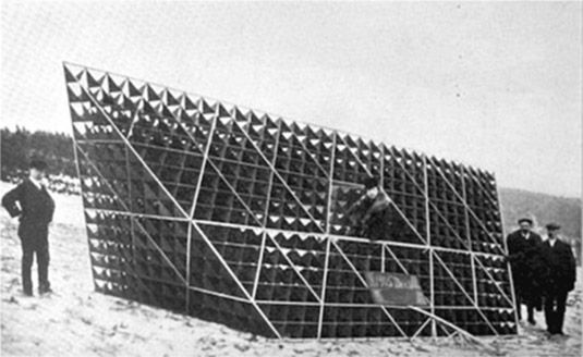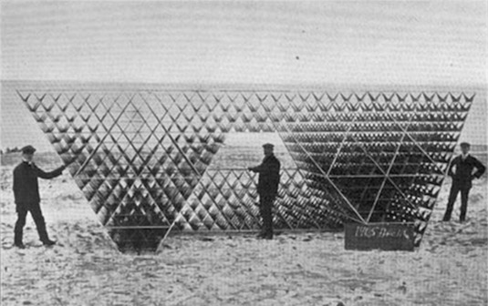I'm always fascinated to see grainy black-and-white pictures of the most crisp, high tech structures. I can't decide which is out of place, the suited and hatted gentlemen or this lightweight hut.