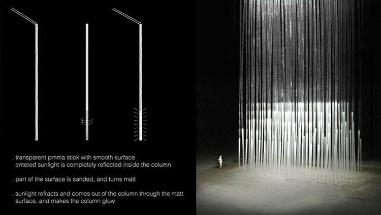 Visitors can thus walk around beneath the surface of the Earth, exploring buried rooms of light.