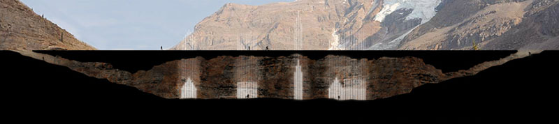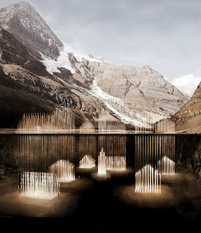 An interesting new project by Bo Li and Ge Men, students of architecture at ETH Zürich, proposes a kind of buried chandelier to memorialize lost villages in Switzerland—architecture destroyed by landslides, replaced by light.