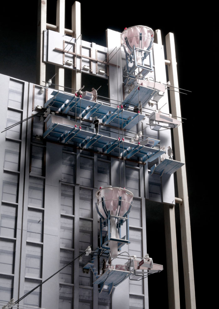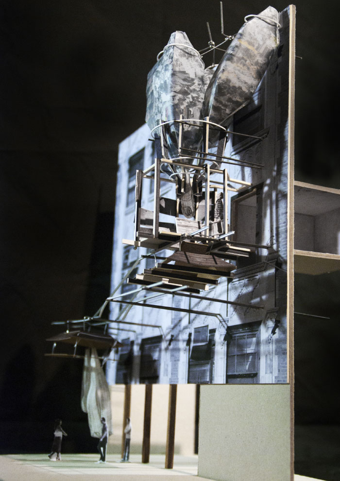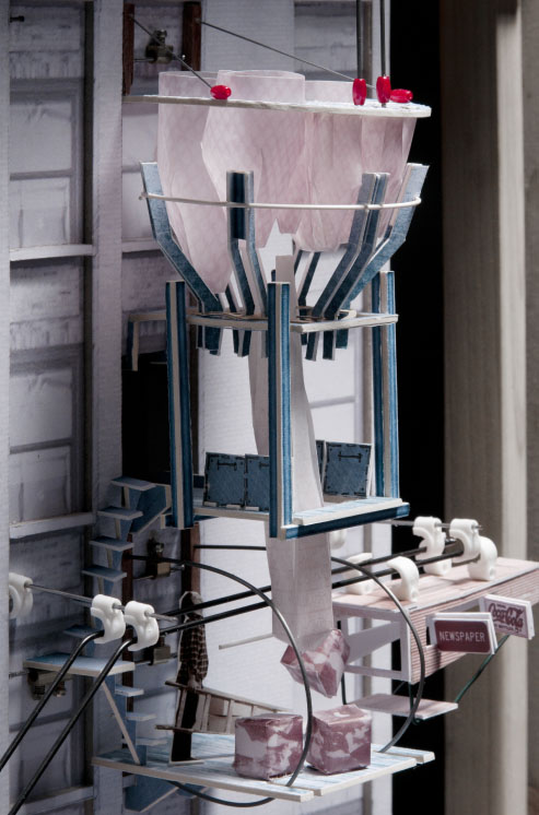 —it is a story told through models: highly detailed models using things such as cable nail clamps, cardboard silhouettes, coat hangers, tracing paper, and beads.