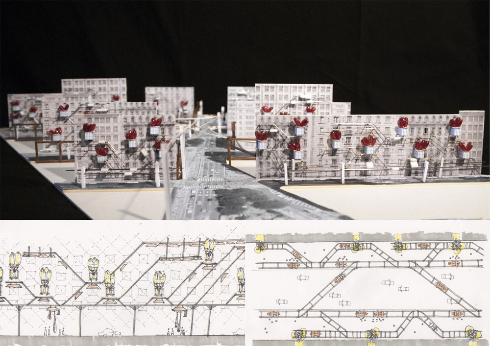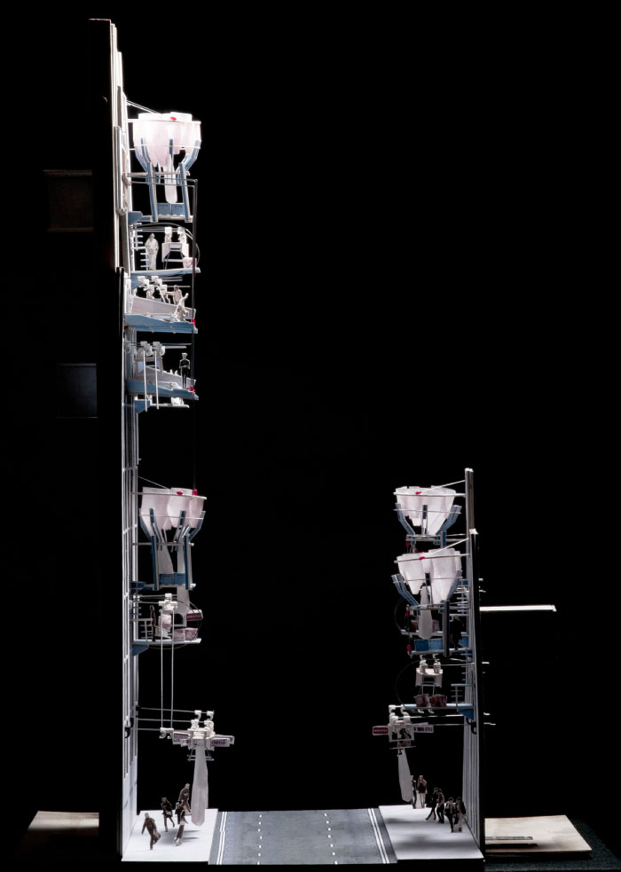 In any case, with New York as her project’s chosen location, Lau explored the spatial possibilities offered by informal street vending, eventually inverting, in her words, the concept of the floating market. Boat-like structures are, instead, routed through the sky via rails, lifts, and crossings bolted onto or otherwise suspended from the fronts of buildings.