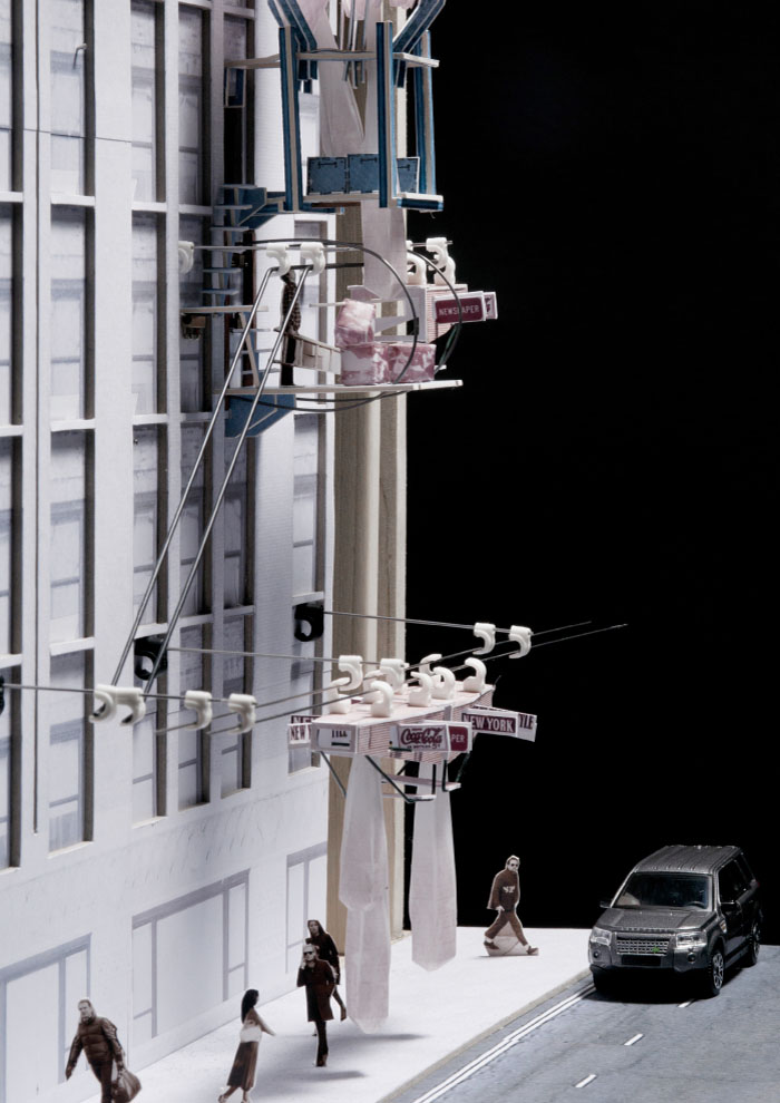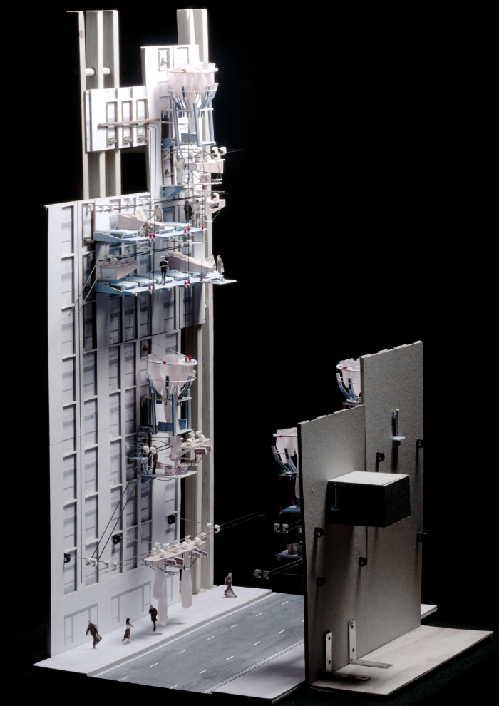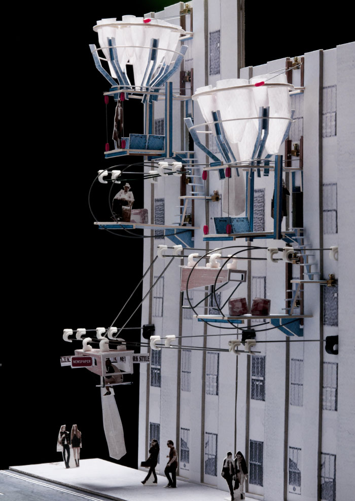 As Lau describes it, “verticality links the street and midair” as “inverted boats trade with dangling pockets,” pockets that hold everything from bouquets of cut flowers to morning newspapers, and “plug-in units with hoppers and platforms” skate above the street on wall-mounted tracks.