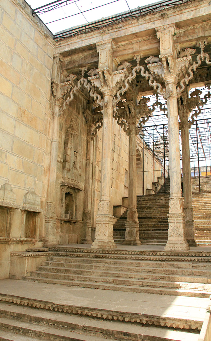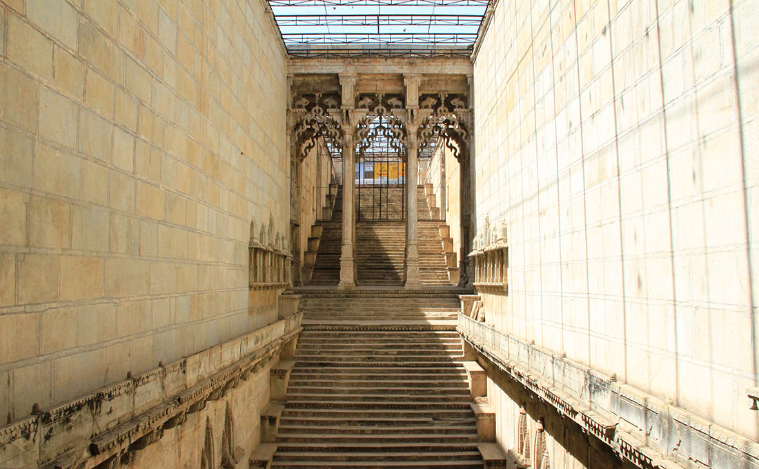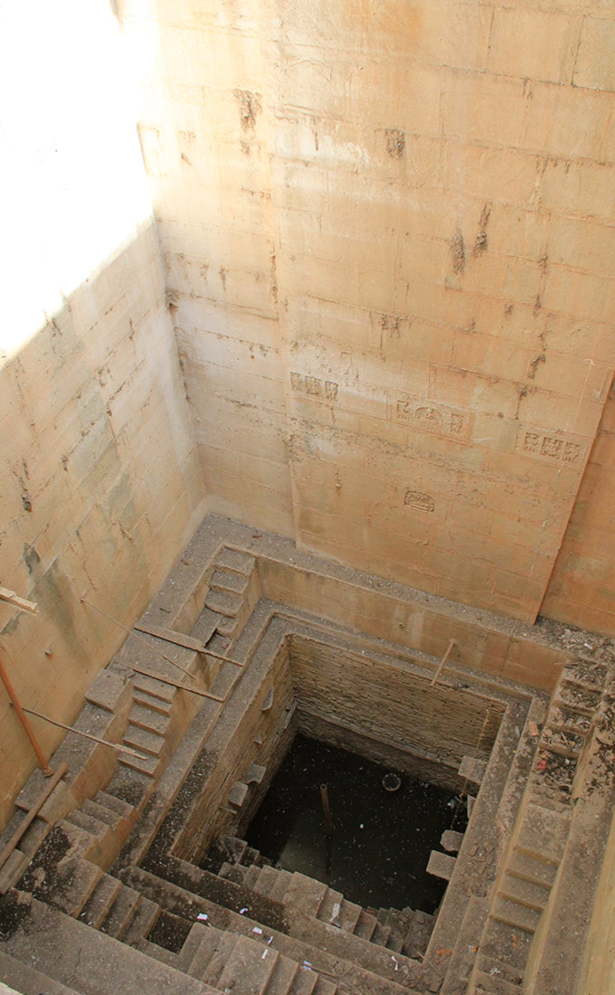 So the Raniji ki Baori is roughly 150 feet deep. A central stairway takes visitors down to the well itself, passing beneath an archway home to bats.