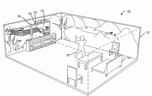 Perhaps it’d be like Microsoft’s patented Immersive Display Experience, an architecture of overlapping stitched projections such that “the peripheral image appears as an extension of the primary image,” and, in the process, the room you’re standing in becomes a game display.