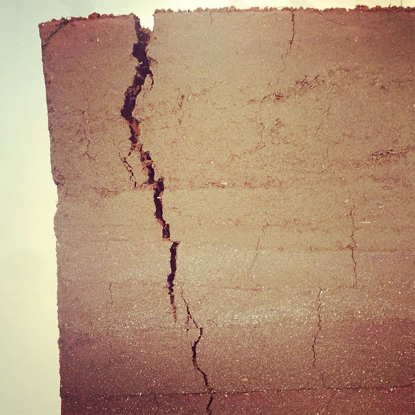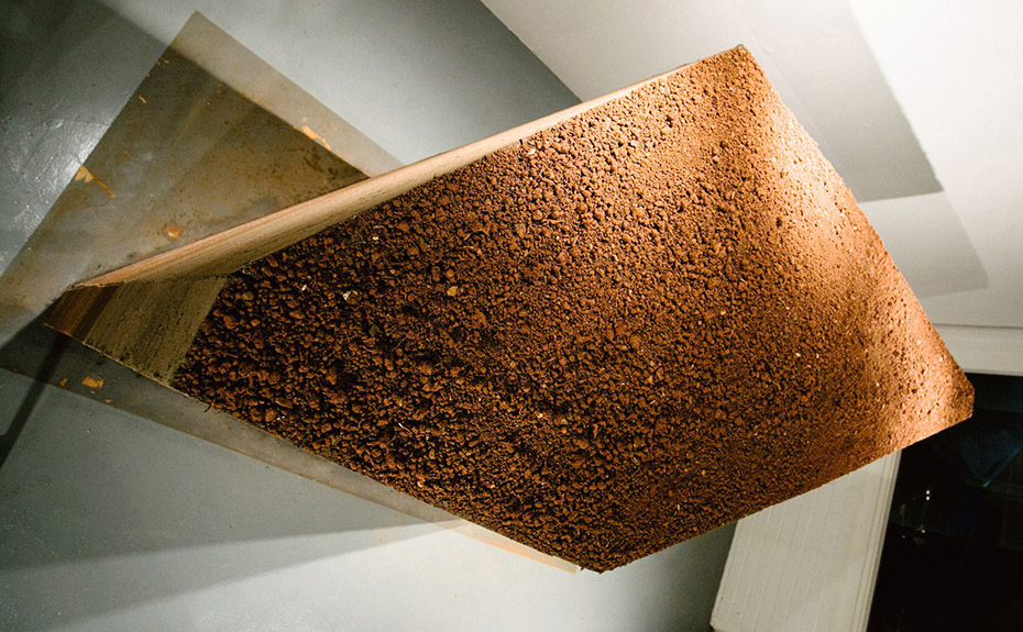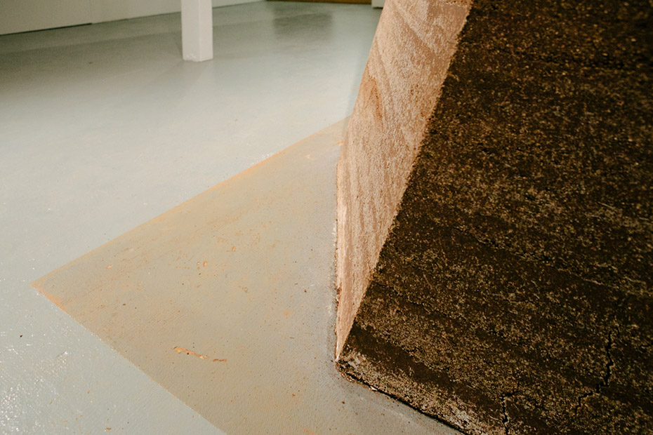 It is a sculpture that slowly falls apart—the earth exhausted from holding itself in place for so long—crumbling back to a less formal and organized condition, leaving chalky, smudged traces like a beach on the gallery floor.