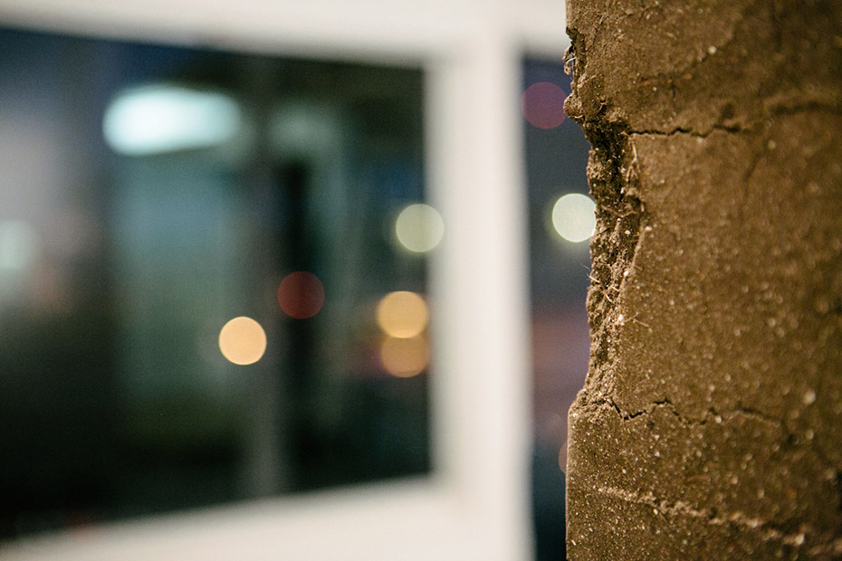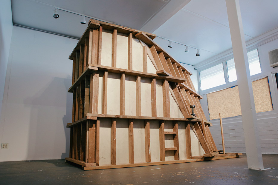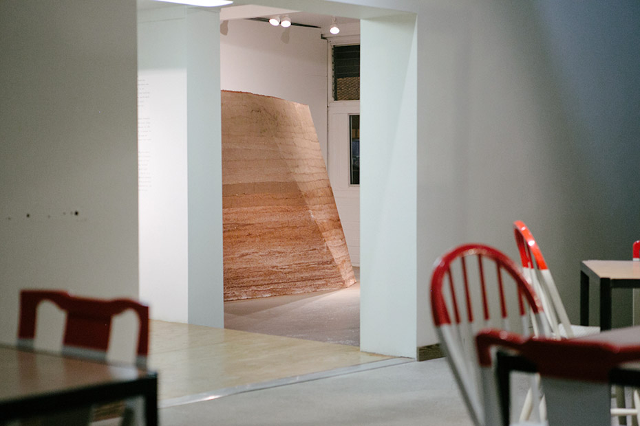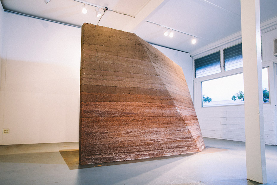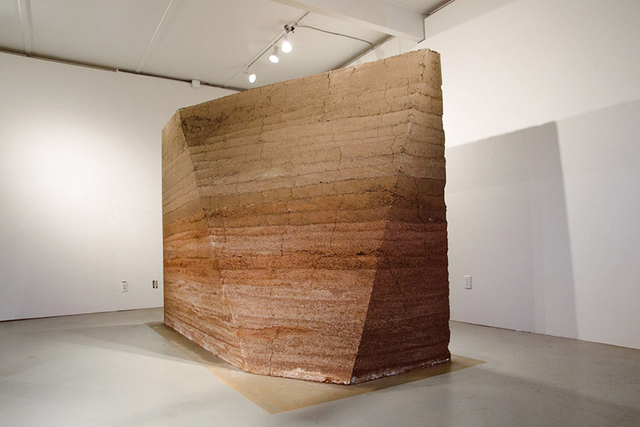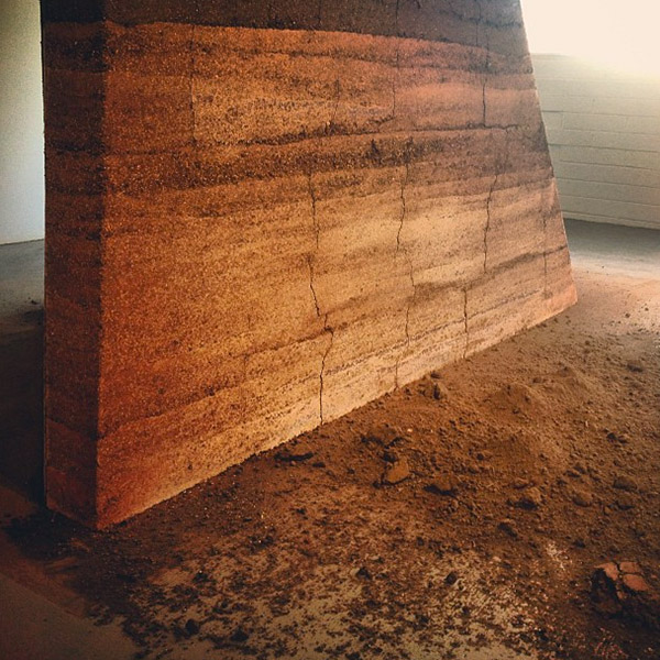 To find out required his own massive earth-moving operation, bringing the 32,000 pounds of soil and sand to the gallery in a truck and carting it in with wheelbarrows; then compressing, framing, and forming the soil into the imposing trapezoid, a rammed earth Euclid.