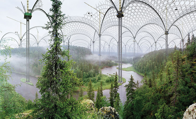But surely this also sets the stage for the design of some incredible future greenhouse somewhere, chilled from within and spanning whole hills, streams, and meadows at a time, where perfectly refrigerated forests grow slowly under controlled conditions to form violins in three centuries: lined with weights and counter-weights, they are pruned, cut, sliced, and pulleyed to stretch the grain toward specific densities, to hit frequencies hundreds of years from now in an echoing concert hall built for music from modified trees.