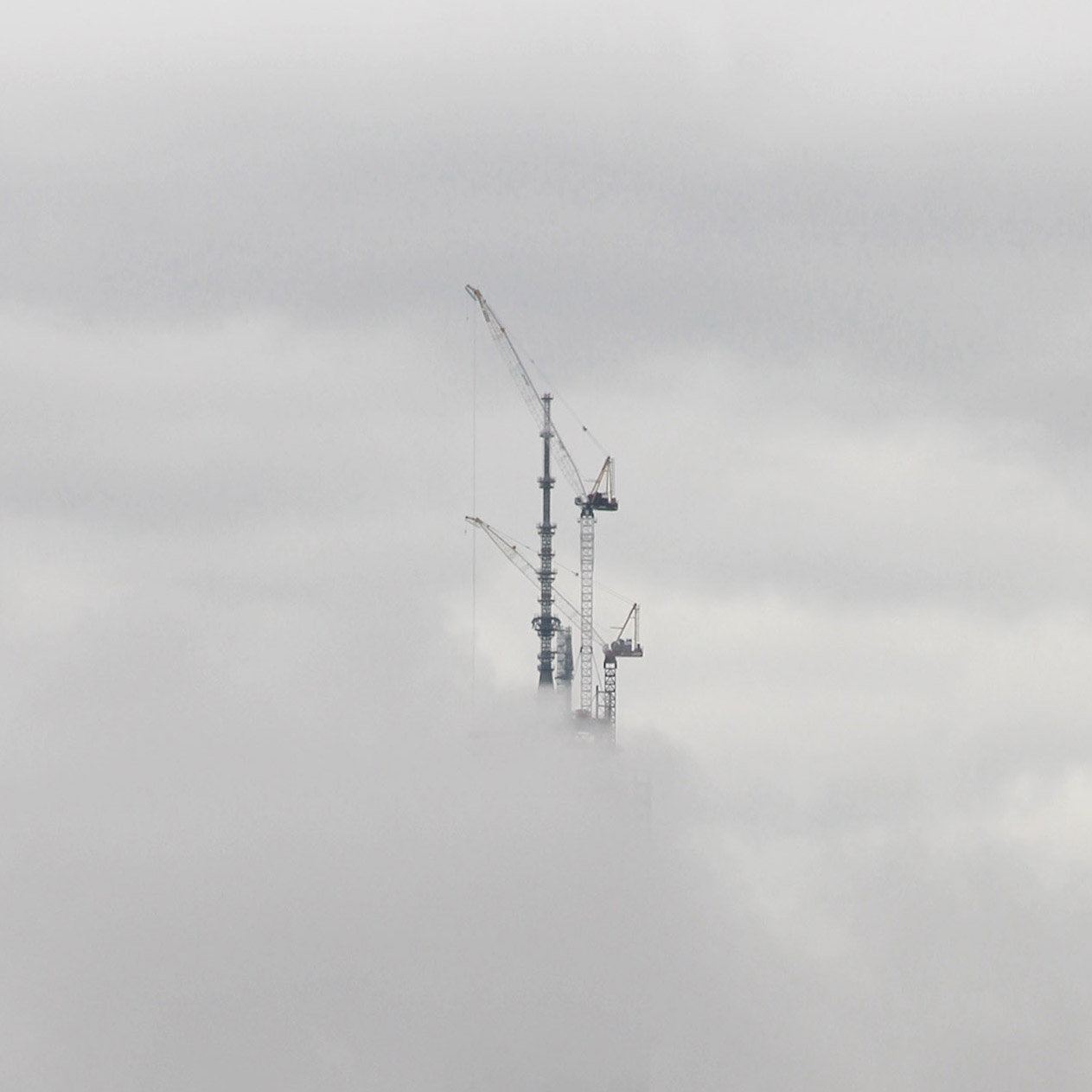 When I walked out to get breakfast this morning, clouds had obscured all but the topmost workings of the 1 World Trade Center site, visible through our living room window—a strange vision of machines, pulleys, cranes, and gears sort of hovering in the sky, like something out of Archigram by way of Hayao Miyazaki.