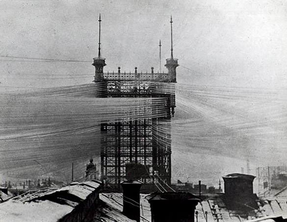 In this case, we’re looking at a telephone tower in downtown Stockholm, one that stood from roughly 1887-1913, and that served at least 5,000 local phones lines—lines that take on the literal feel of a sketch or drawing as they stretch over the streets like some urban-scale loom enthroned over the city, weaving conversations together from every district. It’s a cast-iron stupa through which all voices must pass.