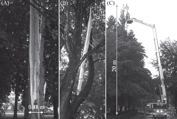 [Image: The stricken poplar tree, from “Seismological Analysis of a Lightning Strike” by Klaus-G. Hinzen].