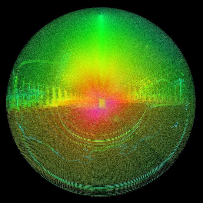 In Shaw’s and Trossell’s own words, “Using terrestrial LIDAR technology it is now possible to capture the world in three dimensions. This technology can create near perfect digital 3D replicas of buildings, landscapes, objects and events. But these digital replicas are always an illusion of perfection. Noise: Error in the Void explores the inherent mistakes made by modern technologies of vision. Here we see the unedited view of the world as seen through the eyes of the LIDAR machine. Reality is shrouded in a cloud of mistaken measurements, confused surfaces and misplaced three-dimensional reflections.”