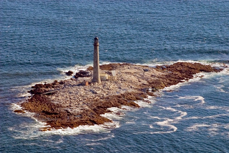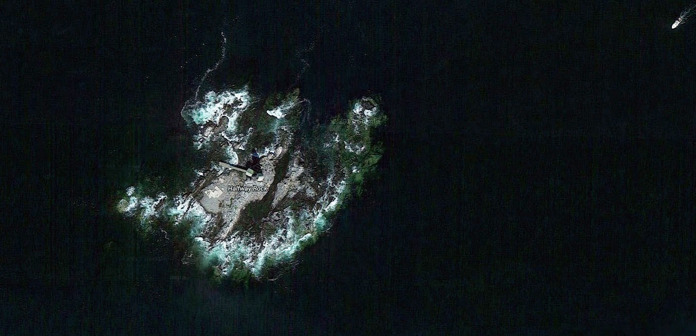 It’s located far to the south of the coast of Bailey Island, on a place called Halfway Rock, due east from Portland in the cold ocean waters of Casco Bay. Indeed, it’s so far out in the waves that Google Maps doesn’t even show detail for the seas around it.