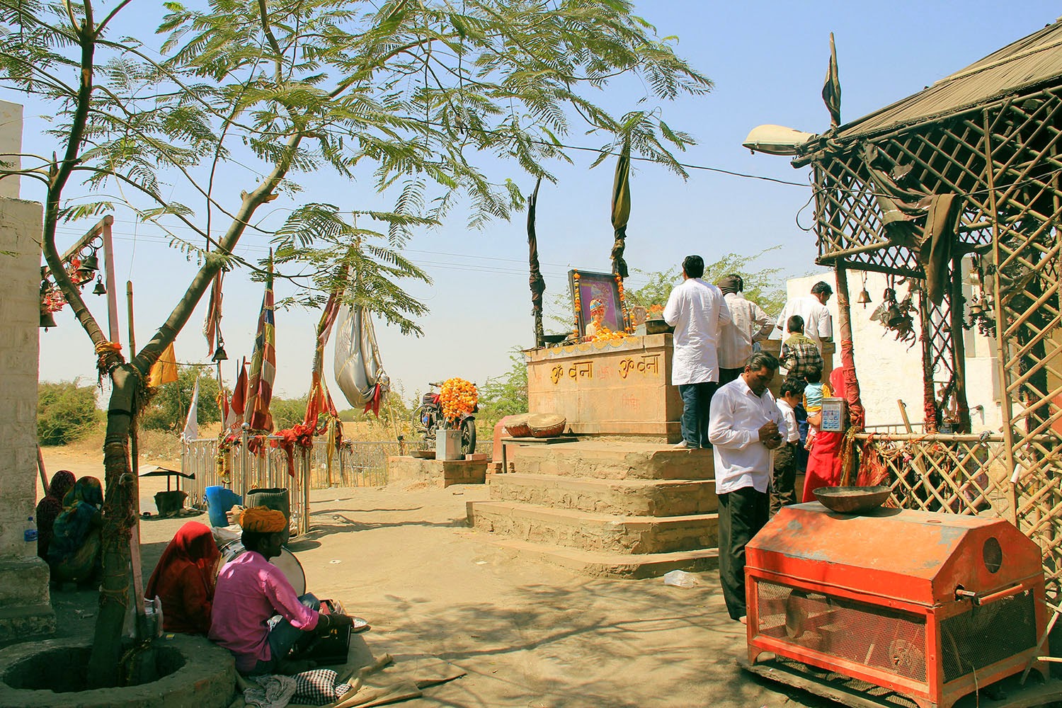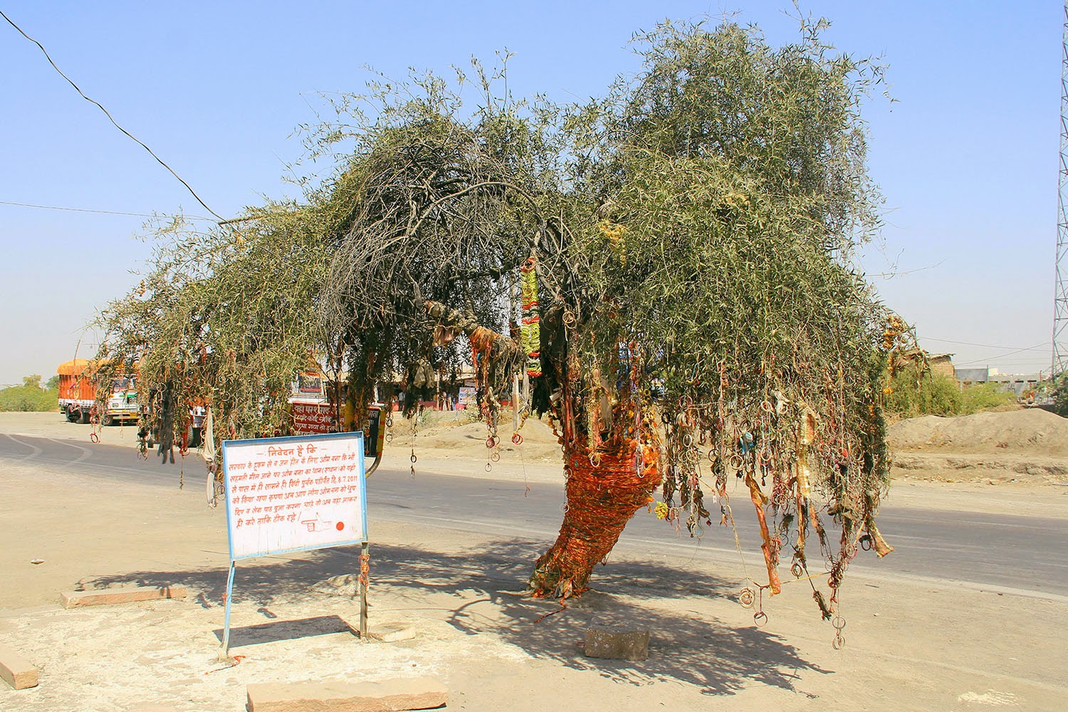 A beautiful tree, wrapped in colorful threads and ornamented from its trunk to its branches with dyed strips of fabric, is the most immediately obvious marker along the cargo-heavy road that passes close by; as it happens, this tree played a central role in the events that would give this site its otherworldly significance.