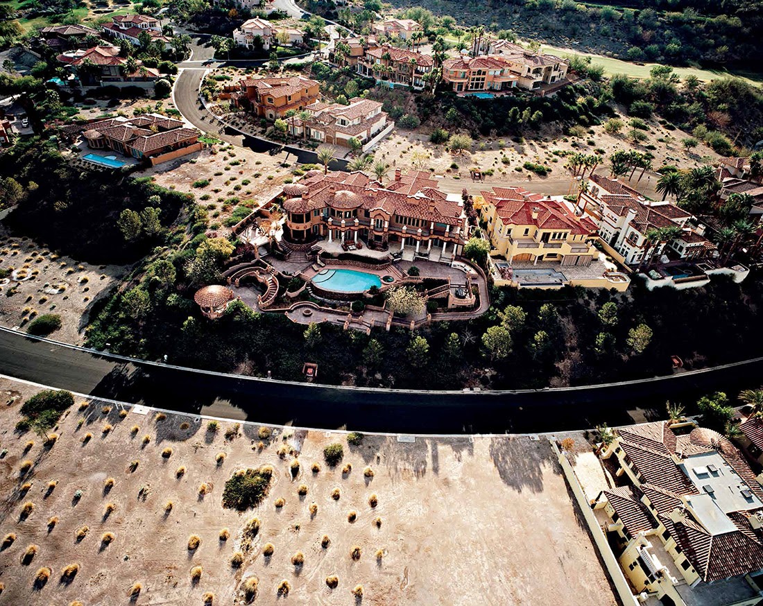 [Image: “Monaco Lake Las Vegas home and foreclosed neighbor, on guard-gated Grand Corniche Drive, Henderson, Nevada,” 2010; from Lake Las Vegas by Michael Light].