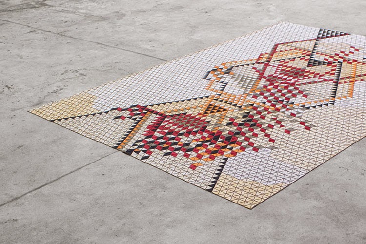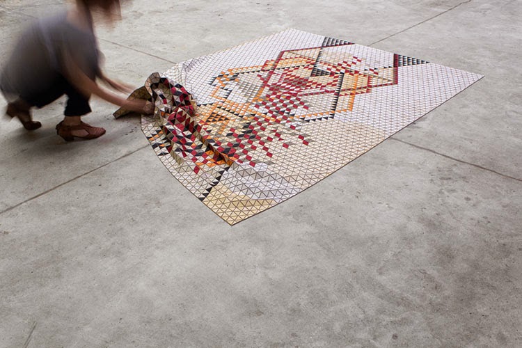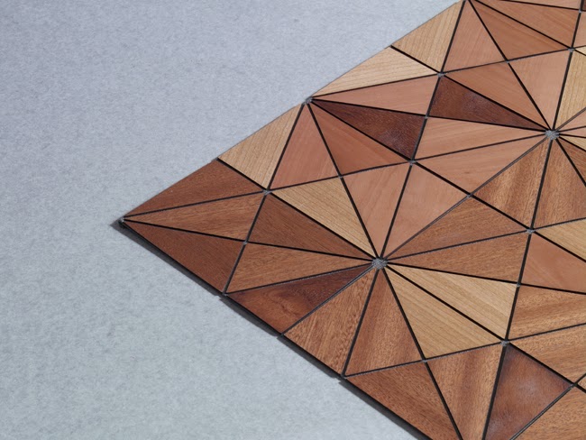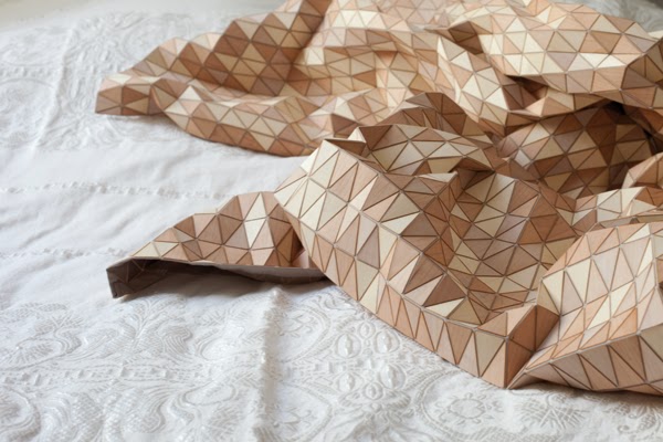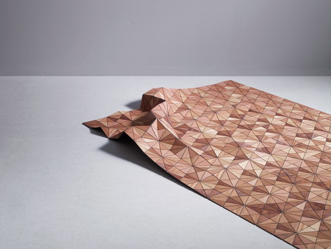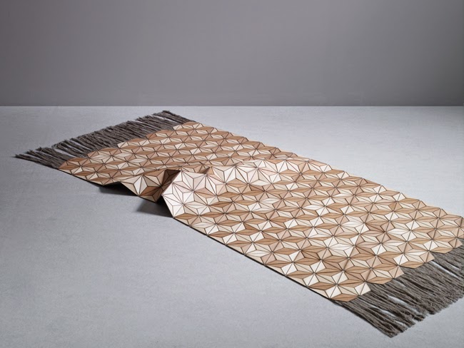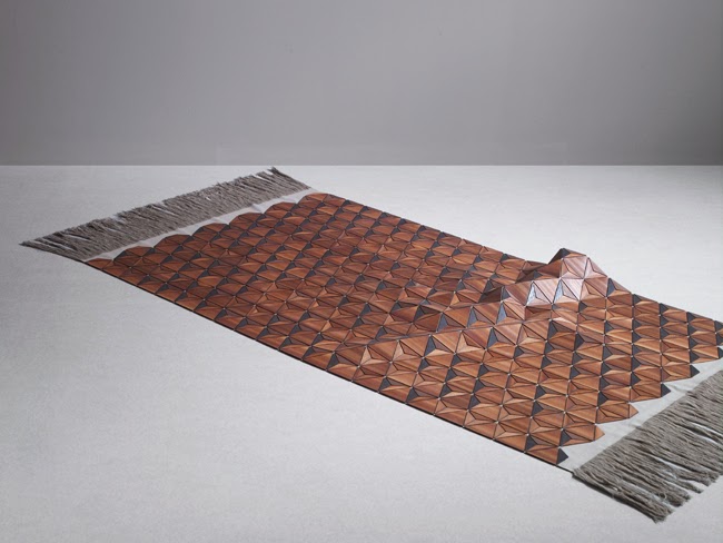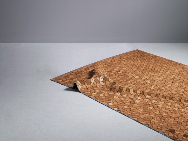 Strozyk writes that she wanted to find “a new tactile experience” for wood, which she achieved by producing wooden tiles that “are then attached to a textile base. Depending on the geometry and size of the tiles each design shows a different behavior regarding flexibility and mobility.”