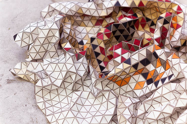 These “different behaviors” can be seen in the following images, where the shape and size of the tiling system dictates the types of ridges and forms that result; while this is obviously interesting from a material standpoint, thinking of these as landscape-modeling exercises lends them a fascinating terrestrial applicability in representing different topographies.
