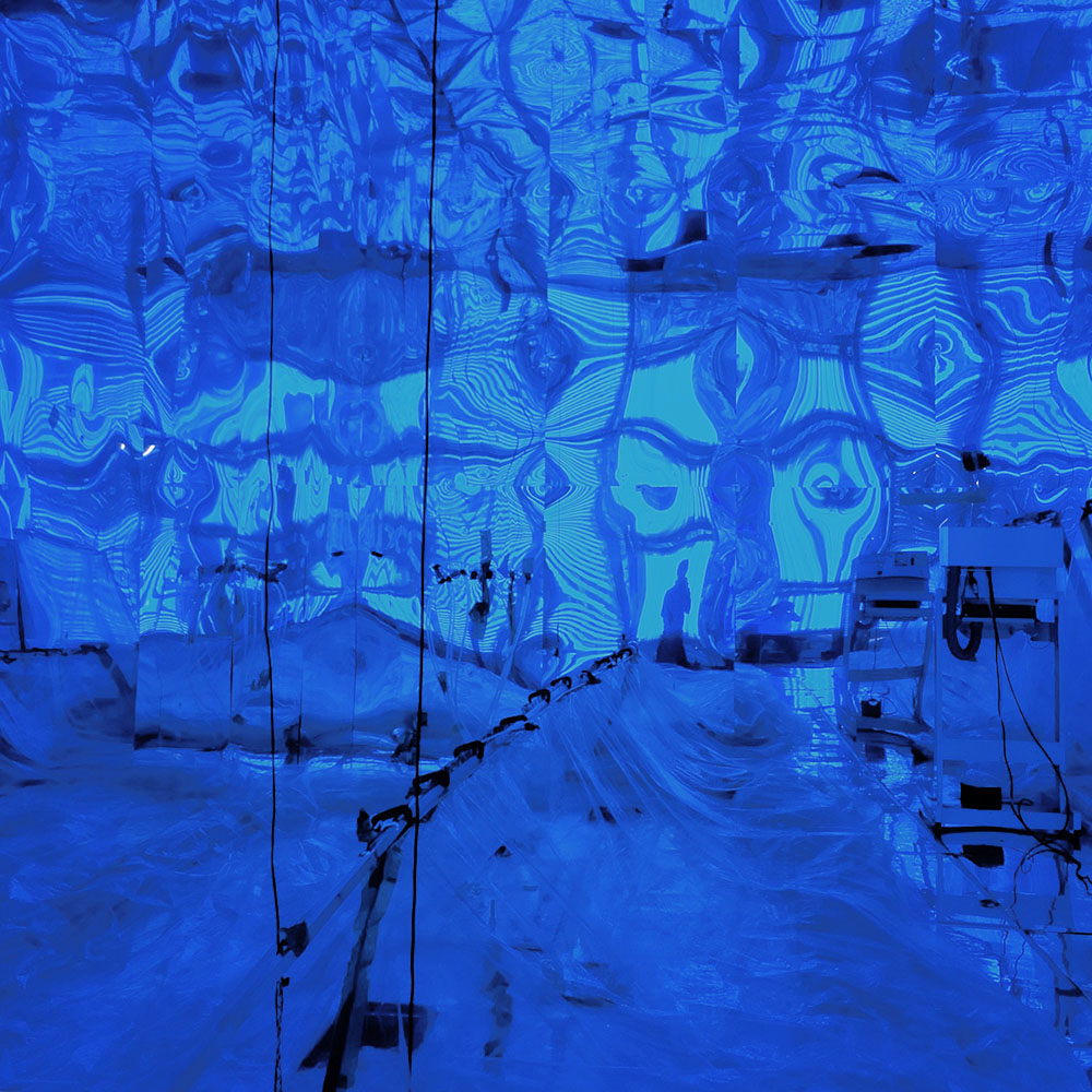 [Image: The reflective walls of the smog chamber under endless black light; Instagram by BLDGBLOG].