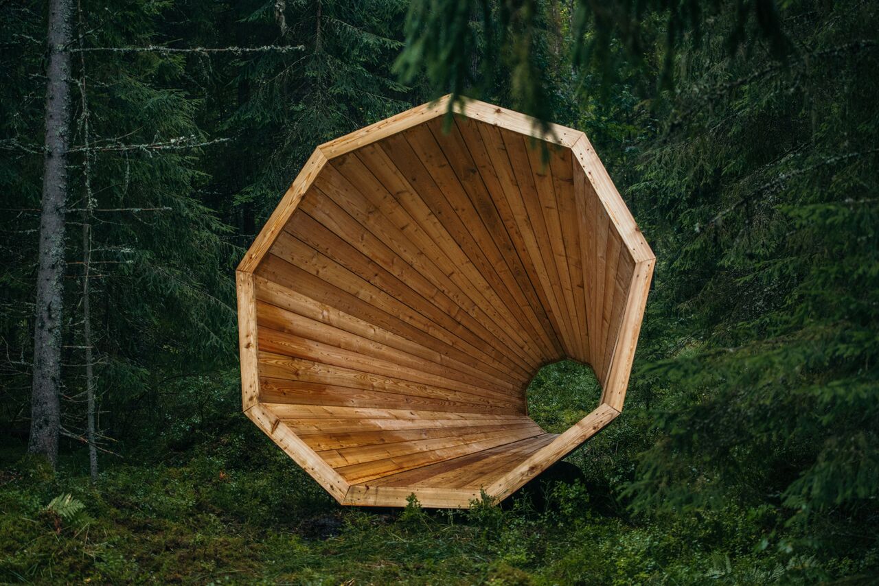 “According to interior architect Hannes Praks,” we read in a newly published press release, “who leads the Interior Architecture Department of the [Estonian Academy of Arts] that initiated the installation project, the three-metre diameter megaphones will operate as a ‘bandstand’ for the forest around the installation, amplifying the sounds of nature.”