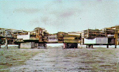 In a recent *New York Times Magazine* profile of earthworks/land-sculptor Michael Heizer, we read about “‘City,’ [Heizer’s] own version of Easter Island or Angkor Wat: a modernist complex of abstract shapes – mounds, prismoids, ramps, pits – to be spread across the valley. It was to be experienced over time, in shifting weather, not from a single vantage point or from above but as an accumulation of impressions and views gathered by walking through it. (…) ‘City,’ in its vastness, was meant to synthesize ancient monuments, Minimalism and industrial technology. The work derived inspiration from Mississippian tumuli (ancient North American mounds), the ball court at Chichen Itza in the Yucatan and La Venta in southern Tabasco… At the same time, it suggested airport runways and Modernist architecture.” (Michael Kimmelman, “Art’s Last, Lonely Cowboy”: 6 Feb 05).