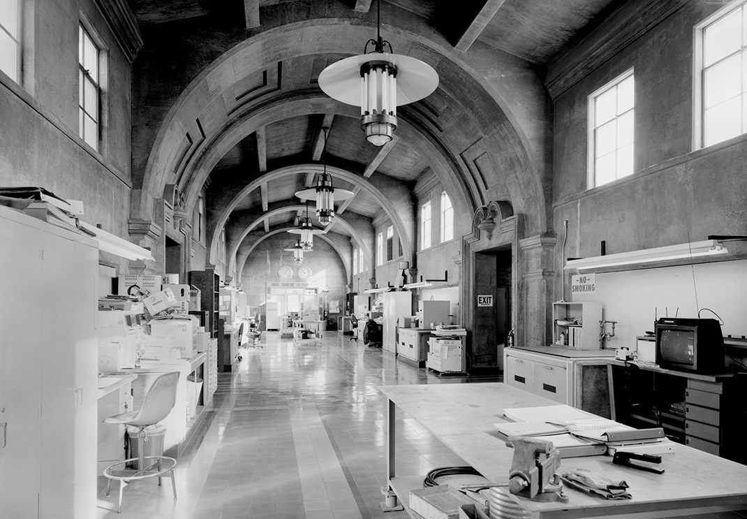 As the open plan interior of a contemporary home, this place would almost undoubtedly show up on every design website today—imagine a better railing on the central staircase, a galley kitchen on one side, a bed lit by retro-styled fluorescent tubes at the far end, some bold moments of color—but it’s just a piece of everyday municipal infrastructure.