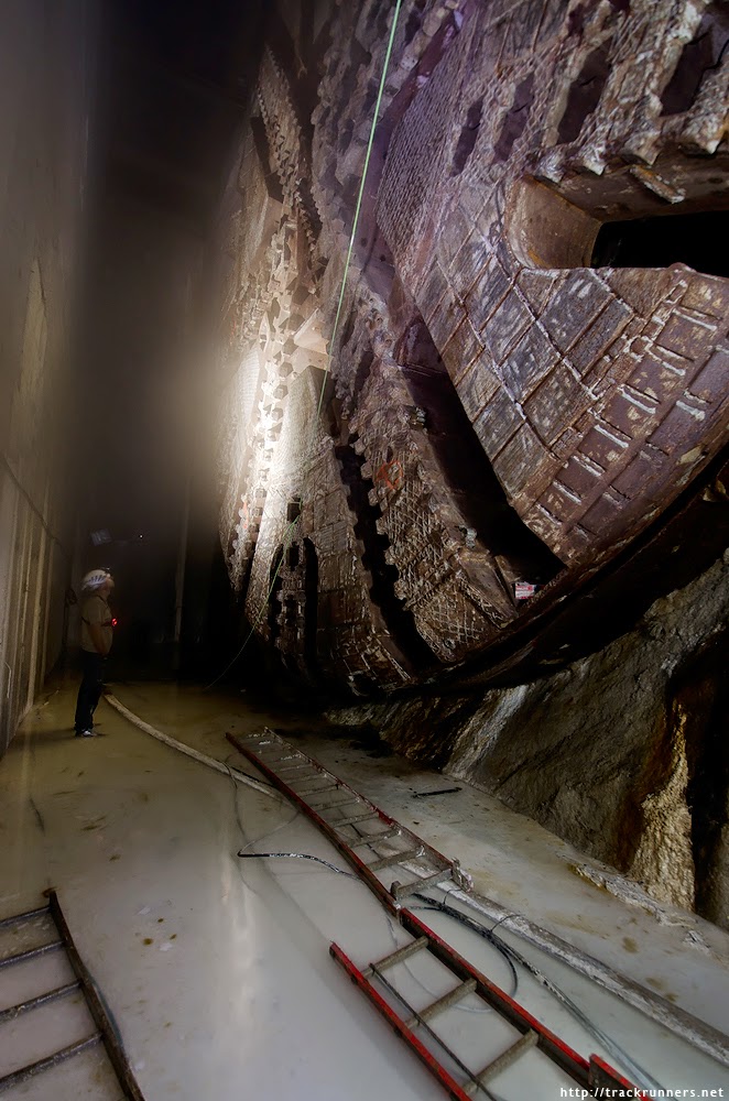 But a way forward was eventually found, and the Kubrickian monolith of this now-stationary drill head was revealed up ahead like some Mayan sculpture in the darkness. Abandoned for now and just lying there: a machine-ruin rusting away in the underground world it had made for itself. The conqueror worm.