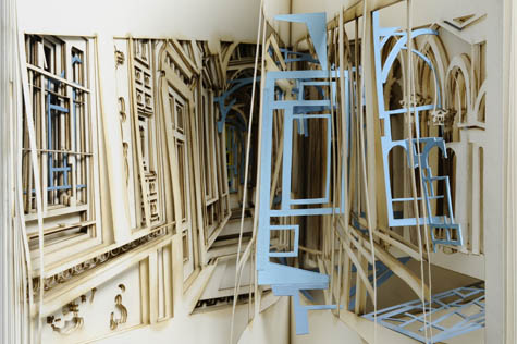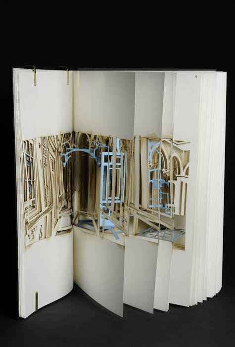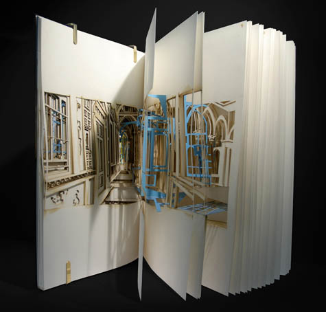 You pick up a book, and you open the covers… and a series of rooms begins to pass by, like the frames of a film or sequences in a flipbook, and it’s all due to laser-cut gaps and remainders. How amazing to think that we could slice entire works of architecture into all the books around us, so that “reading” a book would actually be a forward-moving optical journey through page-sized rooms and hallways.