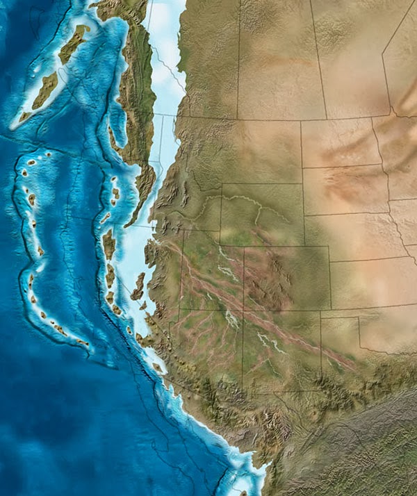 [Image: The west coast of North America, depicted as it would have been 130 million years ago; the coast is a labyrinth of islands, lagoons, and peninsulas slowly colliding with the mainland to form the mountains and valleys we know today. Map by Ron Blakey].