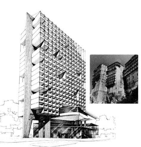 [Image: The Hanging Hotel by Takis Zenetos; think of it as the International Style meets the Potala Palace].
