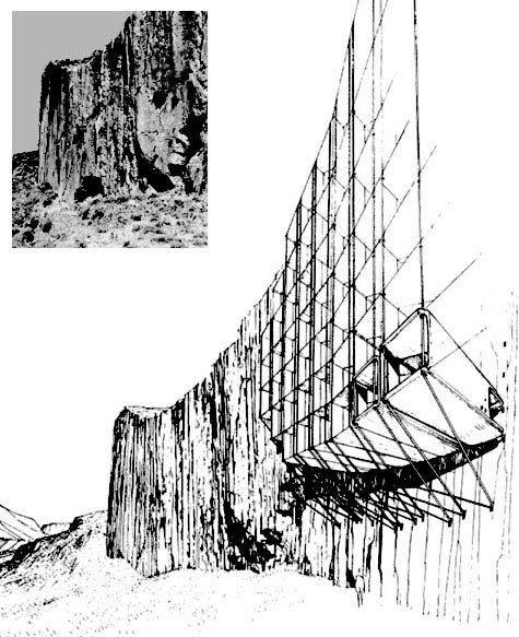 The above project – visible in the next image – is for a hanging hotel, a combination of Tibetan palace, Anasazi cliff dwelling, and artificial geological formation.