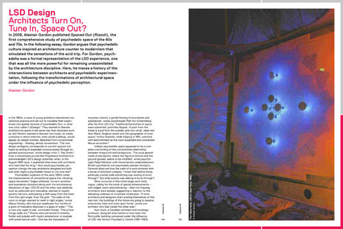 BLDGBLOG: Alistair Gordon’s recent book Spaced Out documents a kind of psychedelic vernacular—hippie enclaves, bubble architectures, parachute-pavilions, paisley walls, irregular room layouts, lots of incense, proud displays of body hair, and so on. Does a focus on this by now fairly clichéd design language play any part in the magazine?