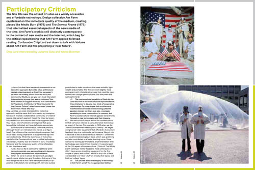 We also talked with Chip Lord, from Ant Farm. I think, for us, what’s interesting about Ant Farm is the question of how architects can integrate new media into their work. With them, the fact that they’d always been interested in broadcasting their work really came to an apotheosis with the development of videotape technology. Video meant that they could incorporate broadcasting directly into the realization of their work, so everything from their “Clean Air” project in Berkeley onward deals with media to a certain extent—using media as a way to telegraph information.