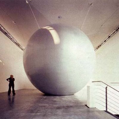 This is the Sonusphere, formerly installed in the Edith Russ Haus, Germany. The Sonusphere musicalizes the effects of plate tectonics: “Modified seismic sensors pick up the normally unheard movements of the earth and are channeled through the entire building until reaching a ‘crescendo’ in Bain’s sonusphere. Unique in its purpose and design, the sonusphere is essentially a wired, inflatable ball that fills the entire upper floor and takes signals generated from an acoustic network running through the entire architecture. It acts as a low frequency, 360 degree, acoustic radiator translating the sound to its curved walls as physically pulsating sound pressure.”