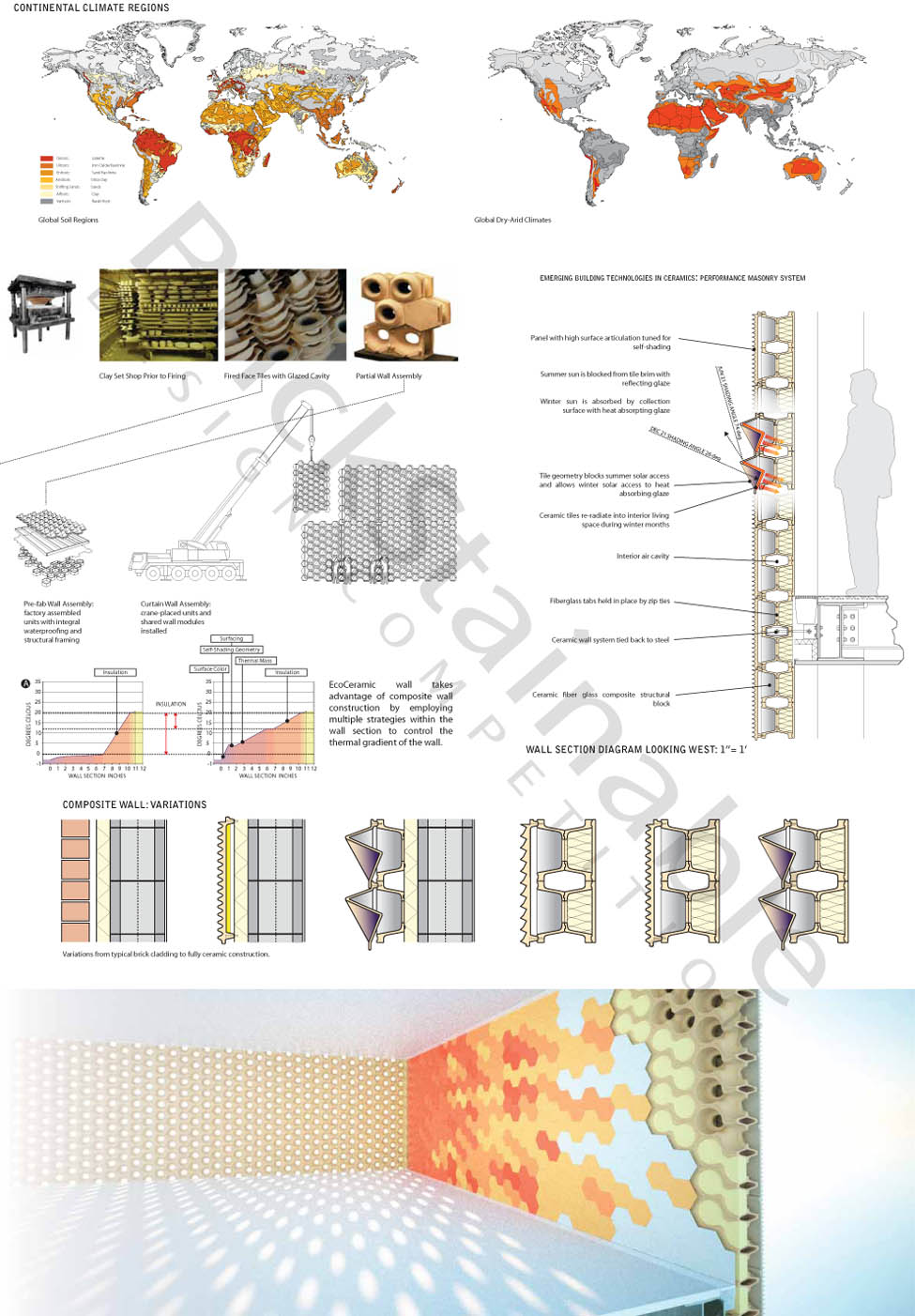 As Brickstainable describes it, their brick system “showcases the ability to look at new ceramic-based wall assemblies. Strategies include thermal dynamics, self-shading, moisture reduction, hydroscopic, evaporative, and termite behavior studies.”