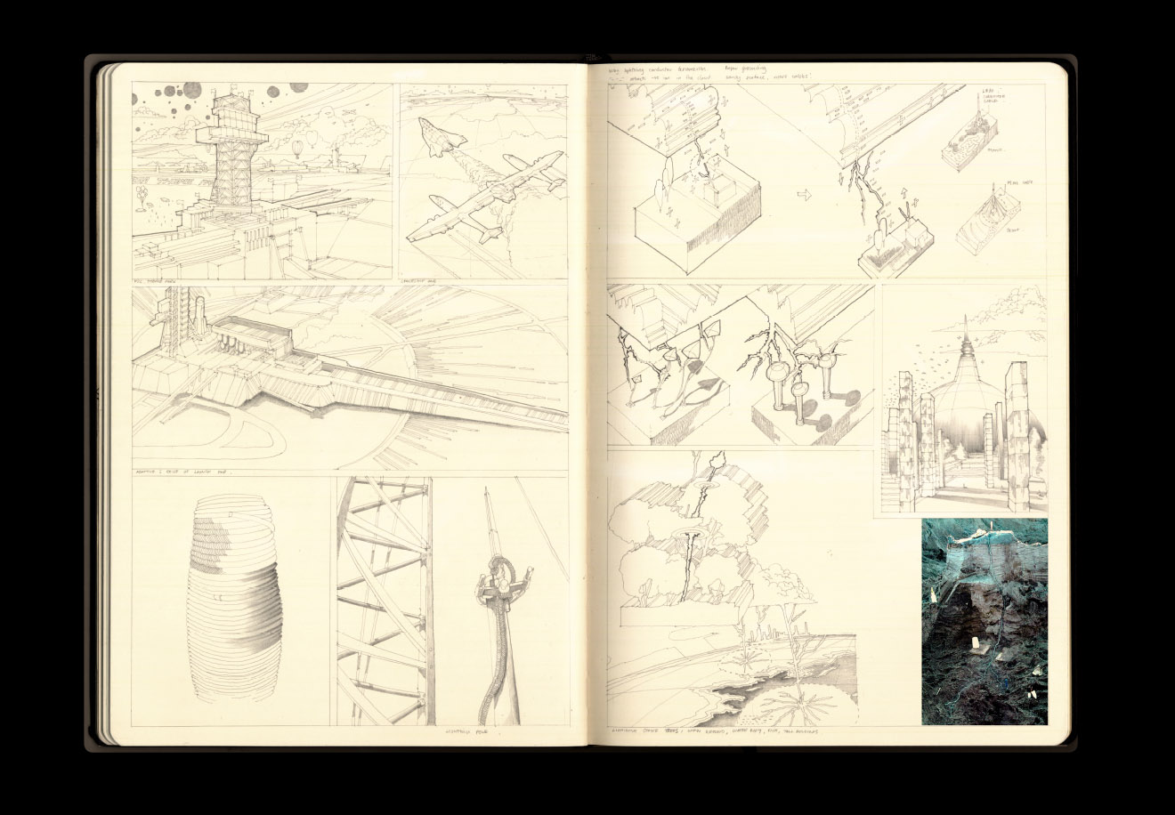 In short, her design proposes a new infrastructure of “rocket-triggered lightning technology,” assisted and supervised by a peripheral network of dirigibles—floating airships that “surround the site and serve as the observatory platform for a proposed lightning visitor centre and the weather research center.”