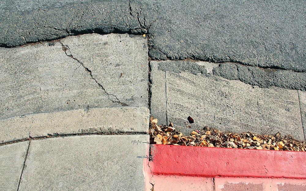 Curbs at nearly the exact same spot on opposite sides of the street are popped out of alignment. Houses too young to show this level of wear stand oddly warped, torqued out of synch with their own foundations, their once strong frames off-kilter. The double yellow lines guiding traffic down a busy street suddenly bulge northward—as if the printing crew came to work drunk that day—before snapping back to their proper place a few feet later.