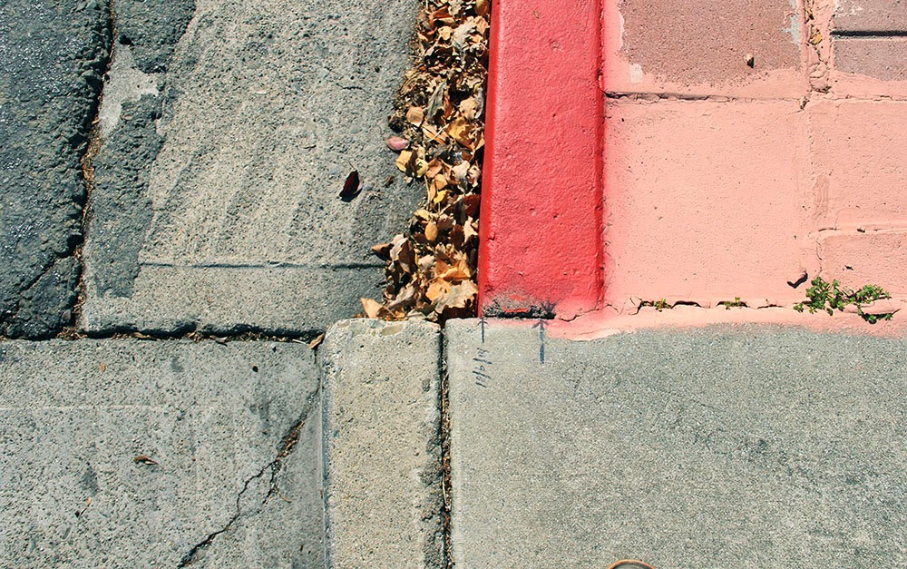 [Image: A curb in Hayward reveals how much the ground is drifting due to “fault creep”: the red-painted part is slowly, but relentlessly, moving north. Photo by Geoff Manaugh].