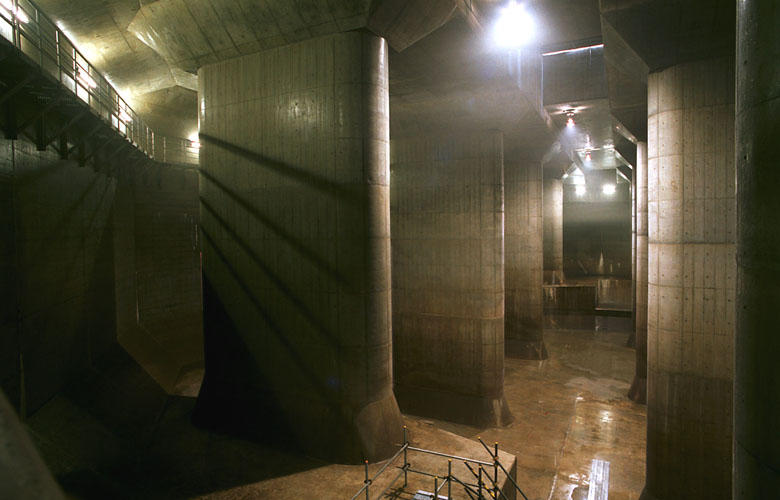 It’s Tokyo’s massive “G-Cans Project,” a subterranean system of polished concrete viaducts built “for preventing overflow of the major rivers and waterways spidering the city.”