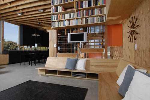 I’m reminded here of Francois Perrin’s Guest House for an Anthropologist, itself also very biblio-intensive: both are houses of exposed wood and polycarbonate, with lots of things to read.