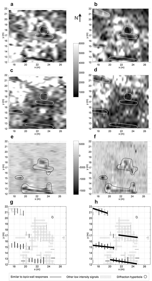 [Image: A selection of “time slices” from the buried buildings of northwestern Argentina; image from, and courtesy of, the Journal of Archaeological Science, “Detecting and mapping buried buildings with Ground-Penetrating Radar at an ancient village in northwestern Argentina,” by Néstor Bonomo, Ana Osella, and Norma Ratto].