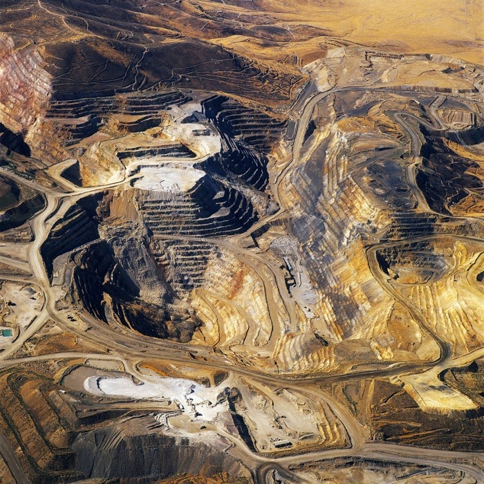 Vast terraced bowls step down—and down and, impossibly, further down—tracking dead faults and mineralization fronts on a scale only made clear when we notice 16-ton trucks like specks of dust on canyon walls. Discolored oceans of chemical runoff wash across vehicle tracks with acid tides. Retaining walls and stabilized slopes loom over assembled superscapes of mine detritus, abandoned shells of industrial insects dwarfed by the world they’ve helped create.